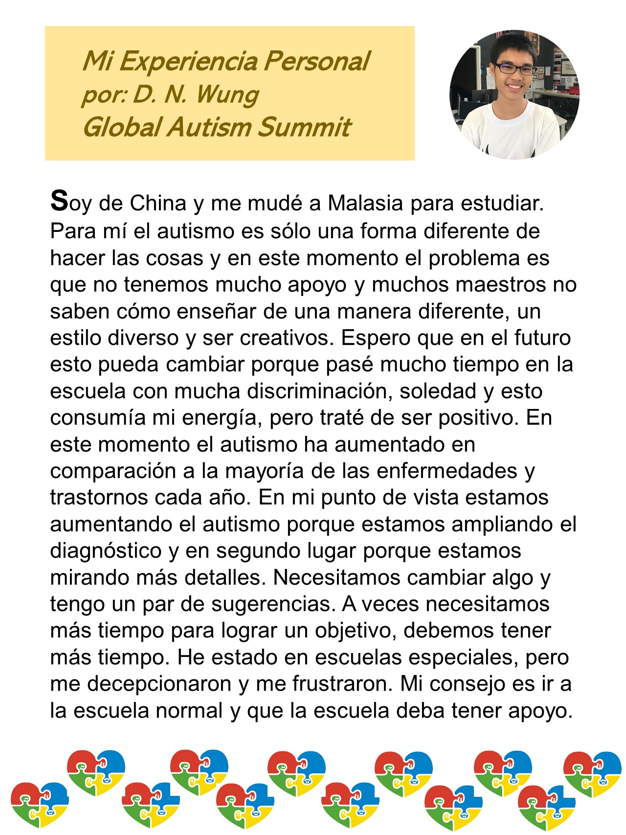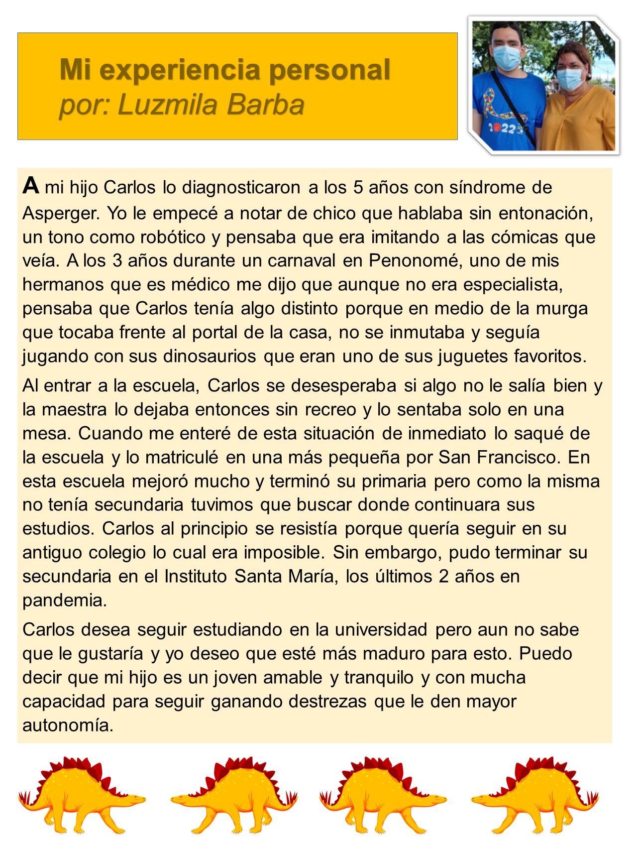 Leer MásMe diagnosticaron con autismo a los 6 años y desde entonces daba terapia psicológica por mi condición ya que me desconcentraba en clase, perdía el hilo y la paciencia ya que me frustraba fácil y esto siempre fue mi problema.